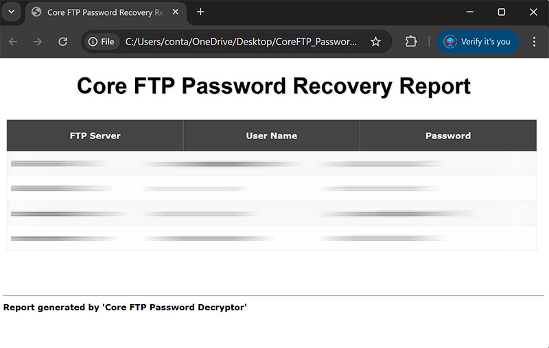 Core FTP stores the password for all the past FTP sessions in user registry location so that user don't have to enter it every time. Core FTP Password Decryptor makes it easy to quickly scan & recover all these stored FTP login passwords.