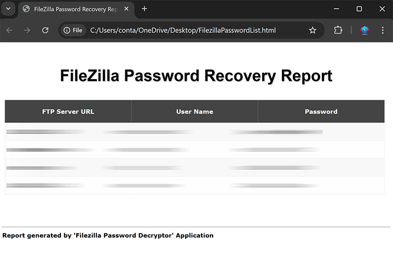 Screenshot 2:  Exported list of of recovered ftp login passwords by FilezillaPasswordDecryptor in HTML format.